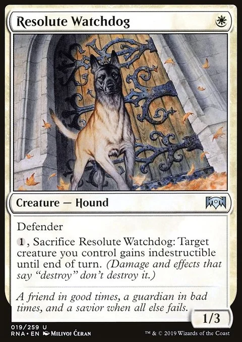 Defender {1}, Sacrifice Resolute Watchdog: Target creature you control gains indestructible until end of turn. (Damage and effects that say "destroy" don't destroy it.)