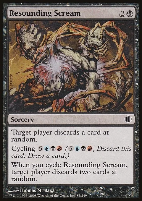 Target player discards a card at random. Cycling {5}{U}{B}{R} ({5}{U}{B}{R}, Discard this card: Draw a card.) When you cycle Resounding Scream, target player discards two cards at random.