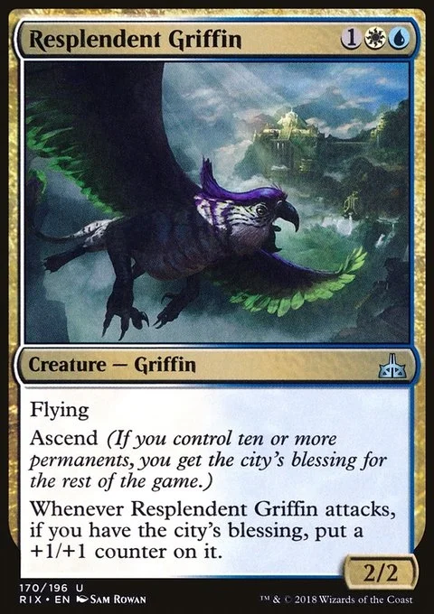 Flying Ascend (If you control ten or more permanents, you get the city's blessing for the rest of the game.) Whenever Resplendent Griffin attacks, if you have the city's blessing, put a +1/+1 counter on it.