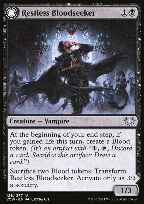 Sacrifice two Blood tokens: Transform Restless Bloodseeker. Activate only as a sorcery.