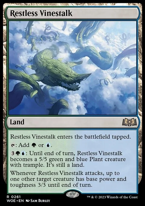 {3}{G}{U}: Until end of turn, Restless Vinestalk becomes a 5/5 green and blue Plant creature with trample. It's still a land.