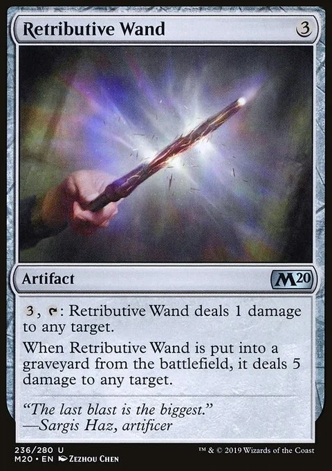 {3}, {T}: Retributive Wand deals 1 damage to any target. When Retributive Wand is put into a graveyard from the battlefield, it deals 5 damage to any target.