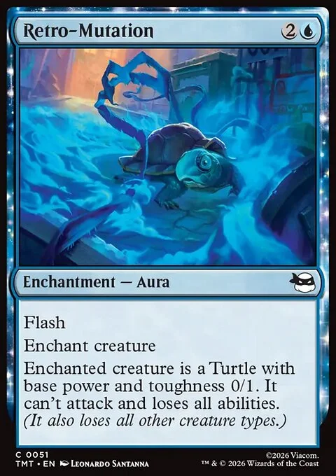 Flash Enchant creature Enchanted creature is a Turtle with base power and toughness 0/1. It can't attack and loses all abilities. (It also loses all other creature types.)