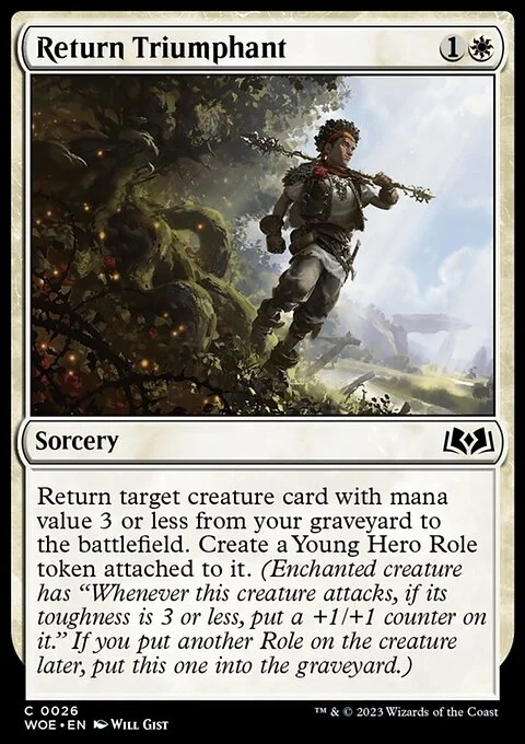 Return target creature card with mana value 3 or less from your graveyard to the battlefield. Create a Young Hero Role token attached to it. (Enchanted creature has "Whenever this creature attacks, if its toughness is 3 or less, put a +1/+1 counter on it." If you put another Role on the creature later, put this one into the graveyard.)