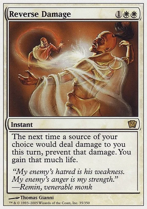 The next time a source of your choice would deal damage to you this turn, prevent that damage. You gain that much life.