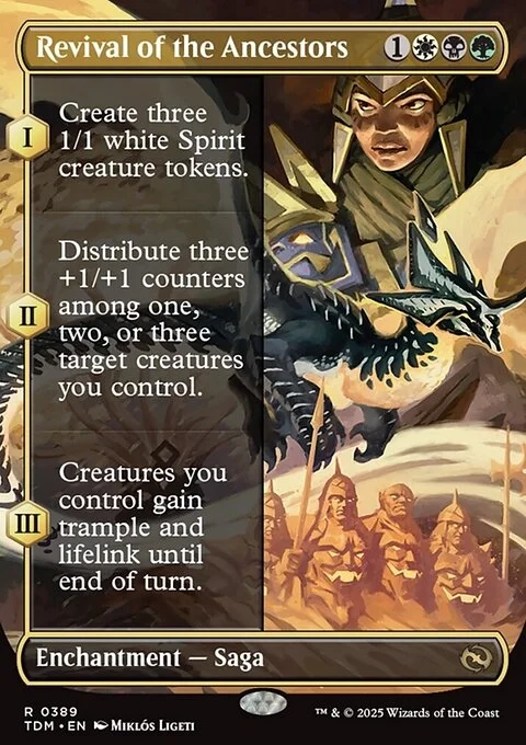 (As this Saga enters and after your draw step, add a lore counter. Sacrifice after III.) I — Create three 1/1 white Spirit creature tokens. II — Distribute three +1/+1 counters among one, two, or three target creatures you control. III — Creatures you control gain trample and lifelink until end of turn.