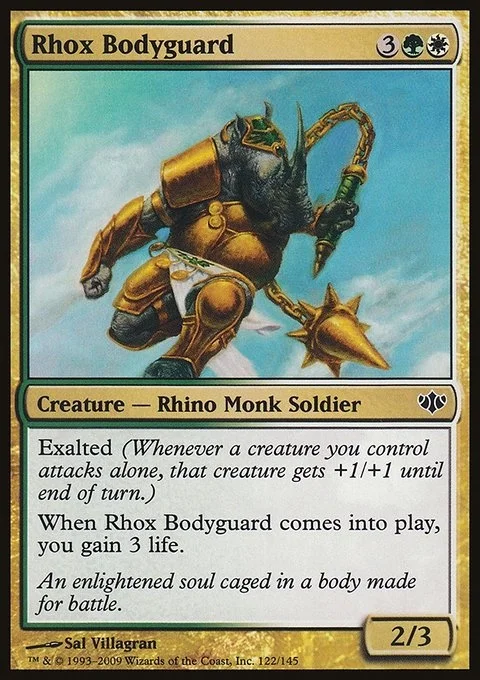 Exalted (Whenever a creature you control attacks alone, that creature gets +1/+1 until end of turn.) When Rhox Bodyguard enters, you gain 3 life.