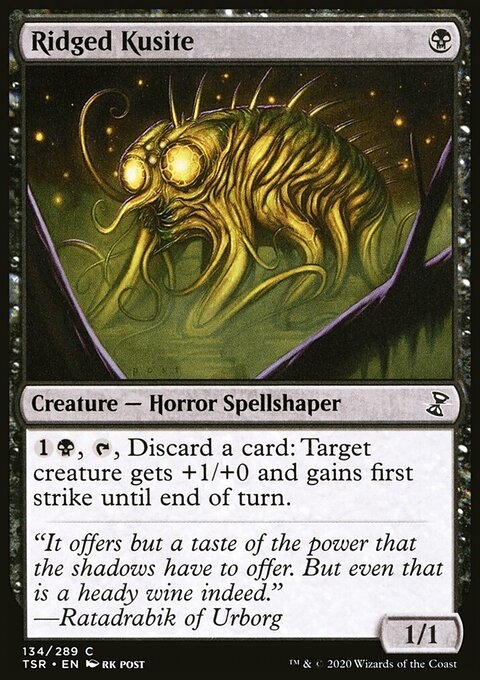 {1}{B}, {T}, Discard a card: Target creature gets +1/+0 and gains first strike until end of turn.