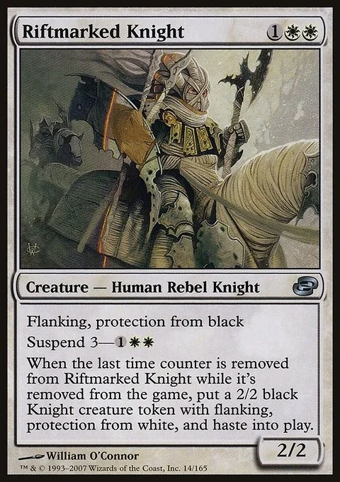 When the last time counter is removed from Riftmarked Knight while it's removed from the game, put a 2/2 black Knight creature token with flanking, protection from white, and haste into play.