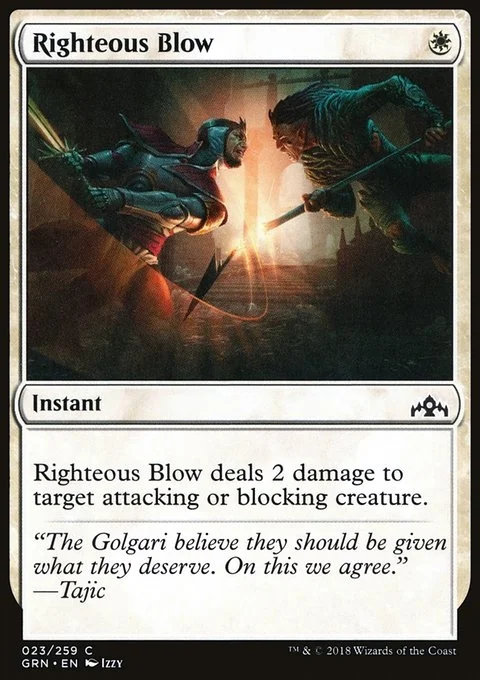 Righteous Blow deals 2 damage to target attacking or blocking creature.