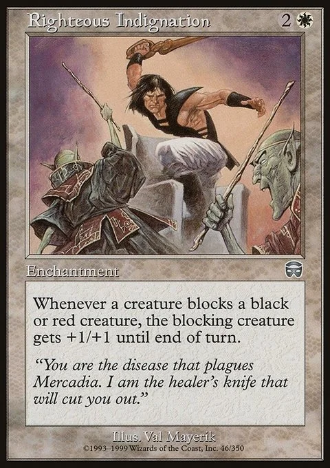 Whenever a creature blocks a black or red creature, the blocking creature gets +1/+1 until end of turn.