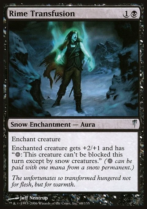 Enchant creature Enchanted creature gets +2/+1 and has "{S}: This creature can't be blocked this turn except by snow creatures." ({S} can be paid with one mana from a snow source.)