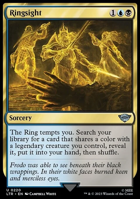 The Ring tempts you. Search your library for a card that shares a color with a legendary creature you control, reveal it, put it into your hand, then shuffle.