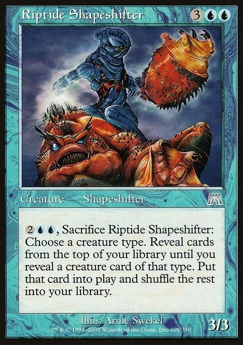 {2}{U}{U}, Sacrifice Riptide Shapeshifter: Choose a creature type. Reveal cards from the top of your library until you reveal a creature card of that type. Put that card onto the battlefield and shuffle the rest into your library.