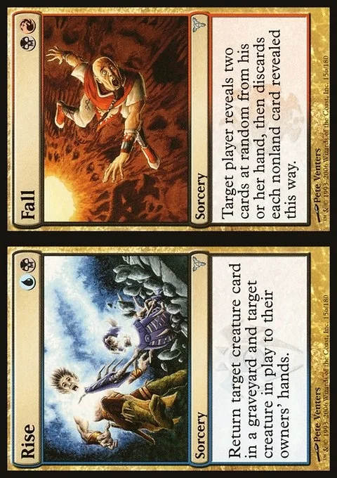 Rise Return target creature card from a graveyard and target creature on the battlefield to their owners' hands. Fall Target player reveals two cards at random from their hand, then discards each nonland card revealed this way.