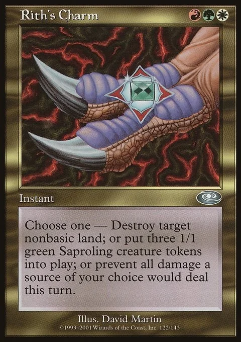 Choose one — • Destroy target nonbasic land. • Create three 1/1 green Saproling creature tokens. • Prevent all damage a source of your choice would deal this turn.