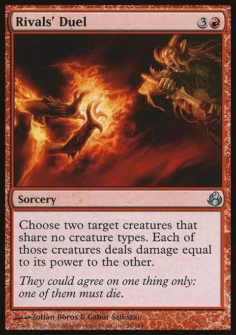 Choose two target creatures that share no creature types. Each of those creatures deals damage equal to its power to the other.