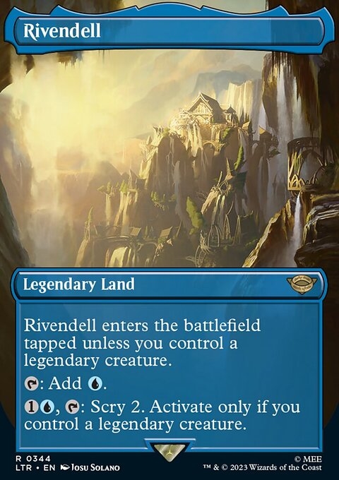 Rivendell enters tapped unless you control a legendary creature. {T}: Add {U}. {1}{U}, {T}: Scry 2. Activate only if you control a legendary creature.