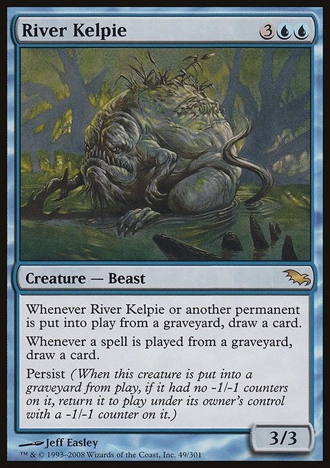 Whenever River Kelpie or another permanent is put into play from a graveyard, draw a card.