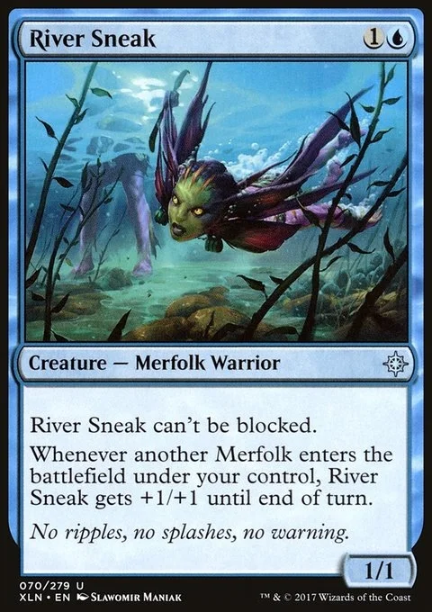 River Sneak can't be blocked. Whenever another Merfolk enters the battlefield under your control, River Sneak gets +1/+1 until end of turn.