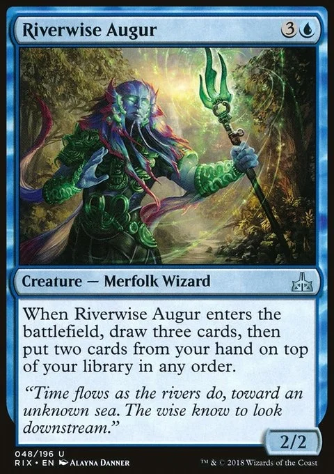 When Riverwise Augur enters the battlefield, draw three cards, then put two cards from your hand on top of your library in any order.