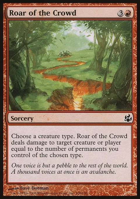 Choose a creature type. Roar of the Crowd deals damage to any target equal to the number of permanents you control of the chosen type.