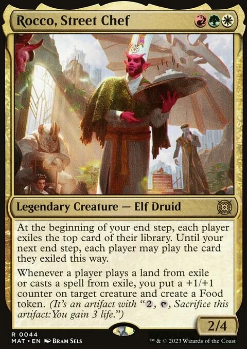 Whenever a player plays a land from exile or casts a spell from exile, you put a +1/+1 counter on target creature and create a Food token. (It's an artifact with "{2}, {T}, Sacrifice this token: You gain 3 life.")
