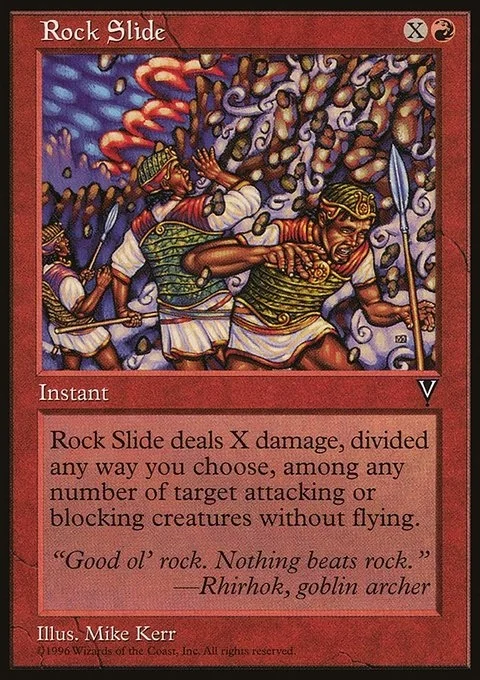 Rock Slide deals X damage divided as you choose among any number of target attacking or blocking creatures without flying.