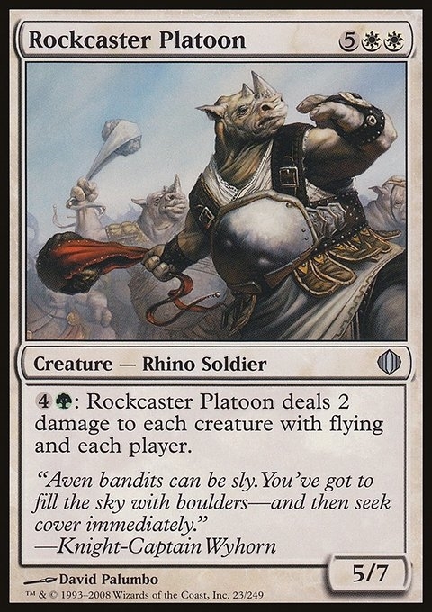 {4}{G}: Rockcaster Platoon deals 2 damage to each creature with flying and each player.