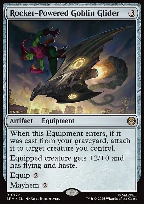 When this Equipment enters, if it was cast from your graveyard, attach it to target creature you control. Equipped creature gets +2/+0 and has flying and haste. Equip {2} Mayhem {2}