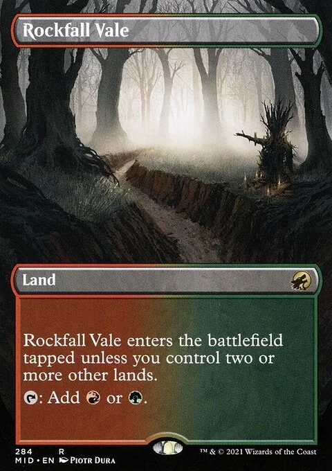 This land enters tapped unless you control two or more other lands. {T}: Add {R} or {G}.