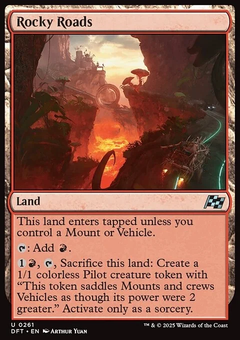 {1}{R}, {T}, Sacrifice this land: Create a 1/1 colorless Pilot creature token with "This token saddles Mounts and crews Vehicles as though its power were 2 greater." Activate only as a sorcery.