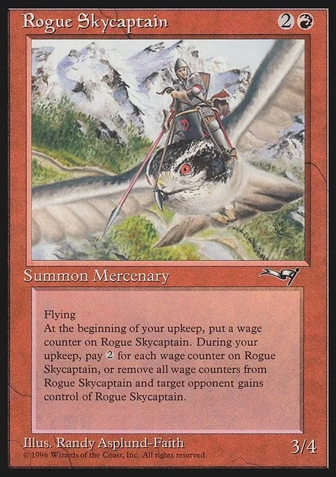 FlyingAt the beginning of your upkeep, put a wage counter on Rogue Skycaptain. During your upkeep, pay 2 for each wage counter on Rogue Skycaptain, or remove all wage counters from Rogue Skycaptain and target opponent gains control of Rogue Skycaptain.