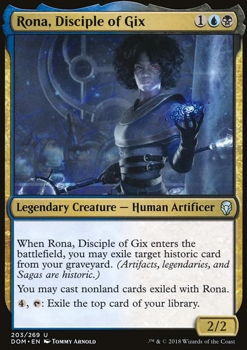 When Rona, Disciple of Gix enters the battlefield, you may exile target historic card from your graveyard. (Artifacts, legendaries, and Sagas are historic.)