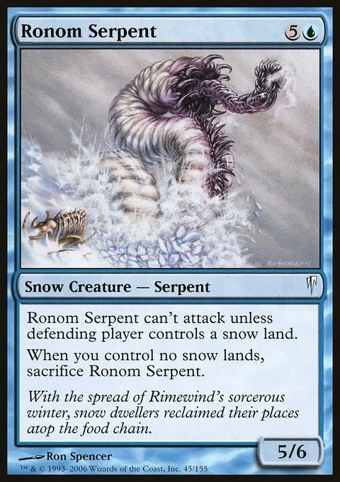 Ronom Serpent can't attack unless defending player controls a snow land. When you control no snow lands, sacrifice Ronom Serpent.