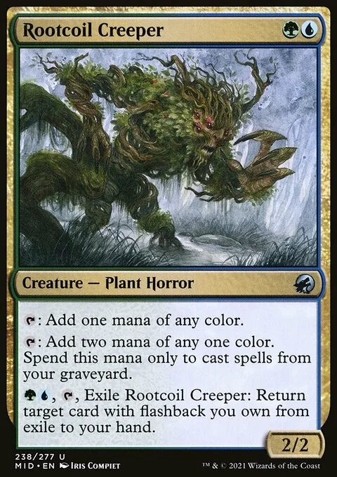 {T}: Add one mana of any color. {T}: Add two mana of any one color. Spend this mana only to cast spells from your graveyard. {G}{U}, {T}, Exile Rootcoil Creeper: Return target card with flashback you own from exile to your hand.