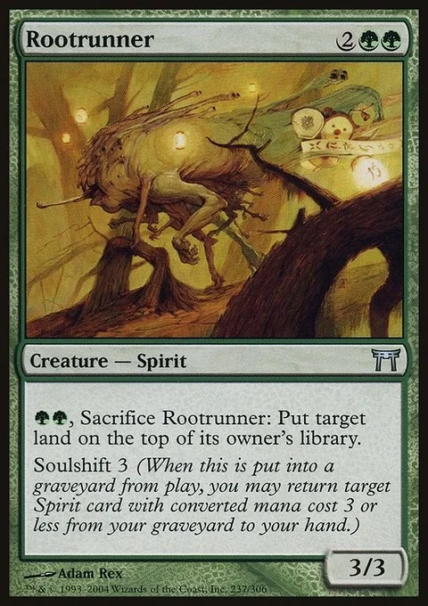 {G}{G}, Sacrifice Rootrunner: Put target land on top of its owner's library. Soulshift 3 (When this creature dies, you may return target Spirit card with mana value 3 or less from your graveyard to your hand.)