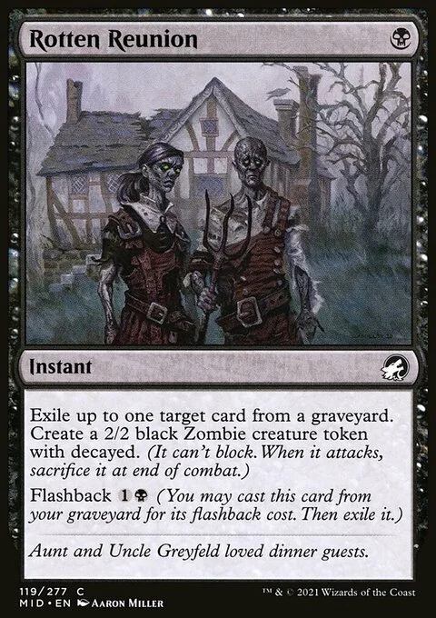 Exile up to one target card from a graveyard. Create a 2/2 black Zombie creature token with decayed. (It can't block. When it attacks, sacrifice it at end of combat.) Flashback {1}{B} (You may cast this card from your graveyard for its flashback cost. Then exile it.)