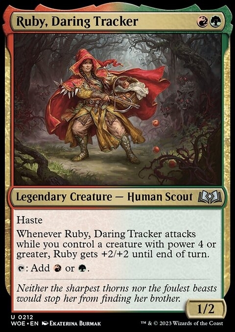 Haste Whenever Ruby, Daring Tracker attacks while you control a creature with power 4 or greater, Ruby gets +2/+2 until end of turn. {T}: Add {R} or {G}.
