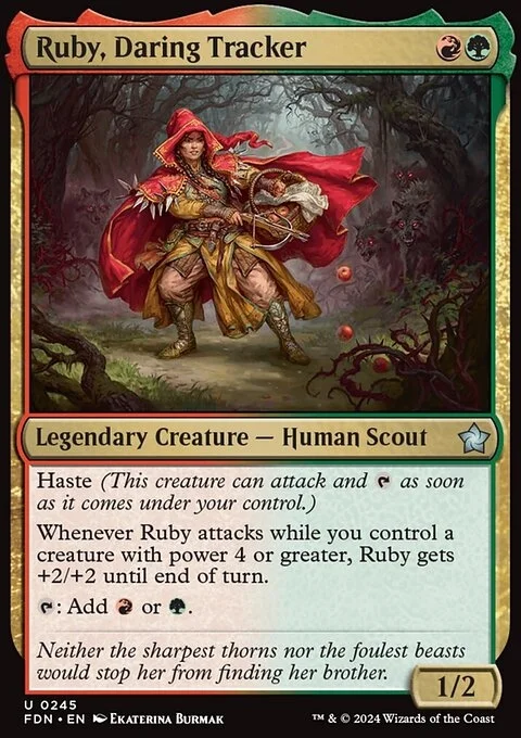 Haste (This creature can attack and {T} as soon as it comes under your control.) Whenever Ruby attacks while you control a creature with power 4 or greater, Ruby gets +2/+2 until end of turn. {T}: Add {R} or {G}.