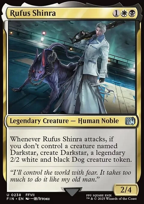Whenever Rufus Shinra attacks, if you don't control a creature named Darkstar, create Darkstar, a legendary 2/2 white and black Dog creature token.