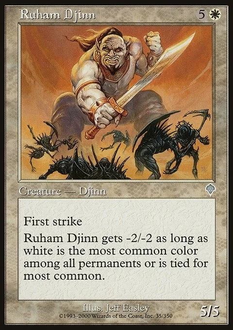 First strike Ruham Djinn gets -2/-2 as long as white is the most common color among all permanents or is tied for most common.