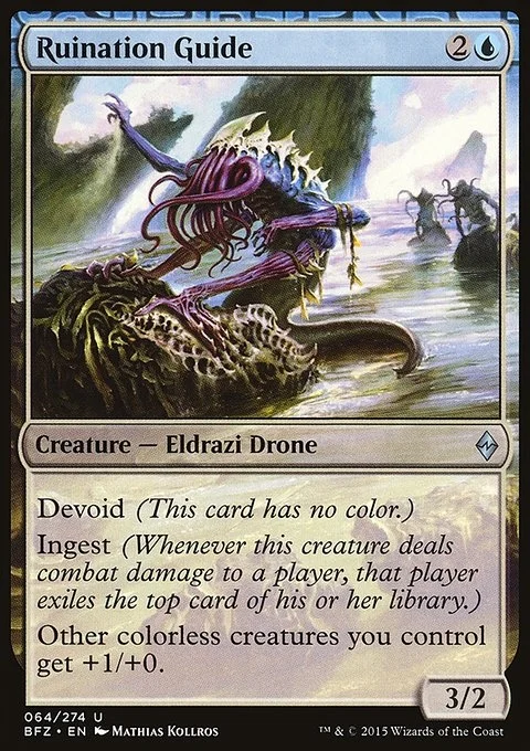 Devoid (This card has no color.) Ingest (Whenever this creature deals combat damage to a player, that player exiles the top card of their library.) Other colorless creatures you control get +1/+0.