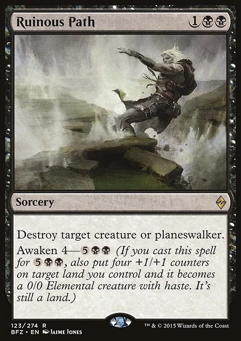 Destroy target creature or planeswalker. Awaken 4—{5}{B}{B} (If you cast this spell for {5}{B}{B}, also put four +1/+1 counters on target land you control and it becomes a 0/0 Elemental creature with haste. It's still a land.)