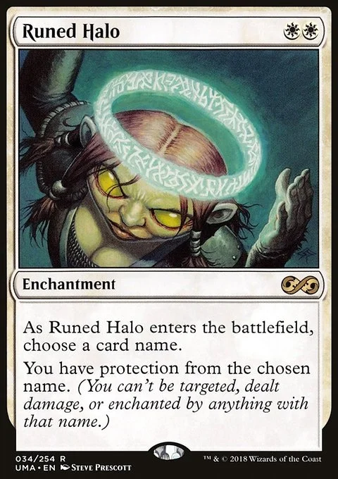 As Runed Halo enters the battlefield, choose a card name. You have protection from the chosen card name. (You can't be targeted, dealt damage, or enchanted by anything with that name.)