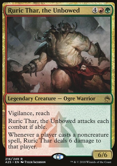 Vigilance, reach Ruric Thar, the Unbowed attacks each combat if able. Whenever a player casts a noncreature spell, Ruric Thar deals 6 damage to that player.