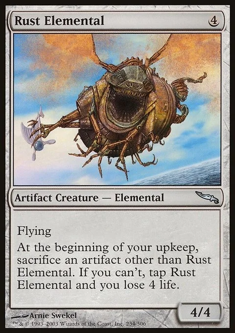 Flying At the beginning of your upkeep, sacrifice an artifact other than Rust Elemental. If you can't, tap Rust Elemental and you lose 4 life.