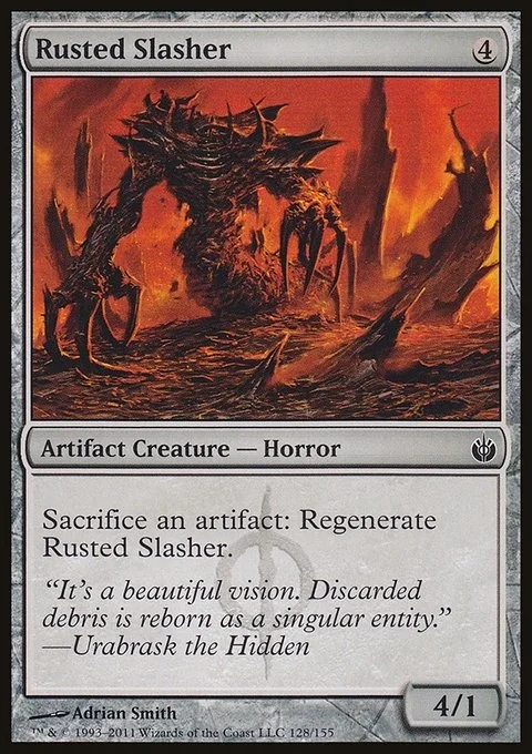 Sacrifice an artifact: Regenerate Rusted Slasher.