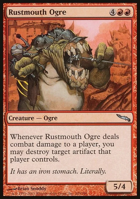 Whenever Rustmouth Ogre deals combat damage to a player, you may destroy target artifact that player controls.