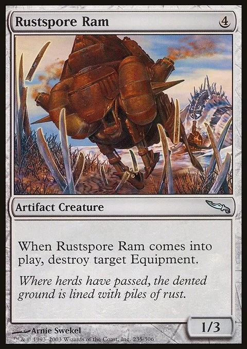 When Rustspore Ram enters the battlefield, destroy target Equipment.